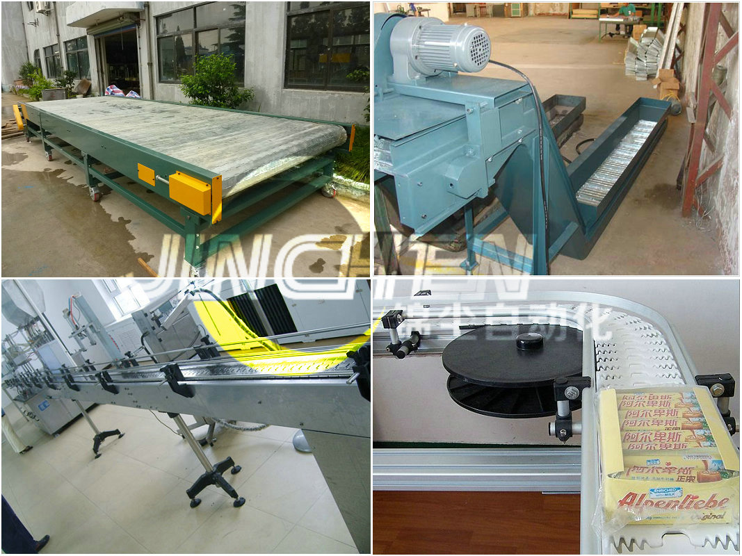鏈板輸送機以標準鏈板為承載面,可以通過多列鏈板并行,適合輸送各類瓶、罐、桶裝物料。